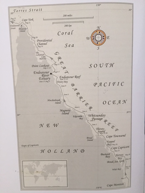 In steering along shore between the Island and the Main, at the Distance of 2 Leagues from the Latter, and 3 or 4 from the former, our soundings were Regular, from 12 to 9 fathoms; but about 11 o’Clock we were again embarrassed with Shoal Water [Blackwood Shoals], but got clear without letting go an Anchor; we had at one time not quite 3 fathoms. At Noon we were about 2 Leagues from the Main land, and about 4 from the Islands without us; our Latitude by Observation was 20 degrees 56 minutes South, Longitude made from Cape Palmerston 16 degrees West; a pretty high Promontory, which I named Cape Hillsborough, [The Earl of Hillsborough was the First Secretary of State for the Colonies, and President of the Board of Trade when the Endeavour sailed.] bore West 1/2 North, distant 7 Miles.