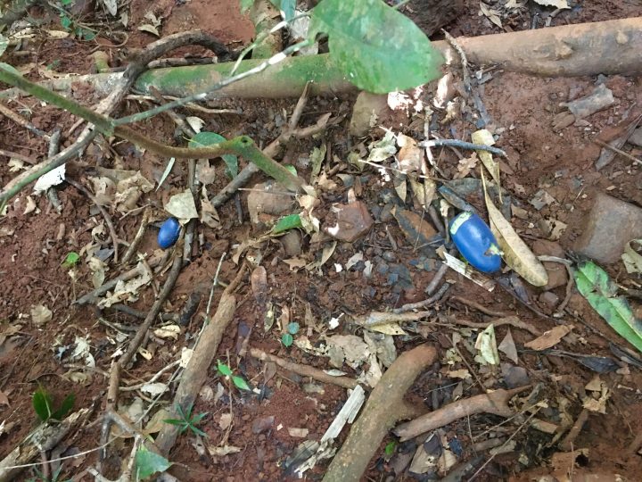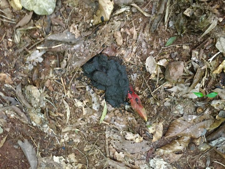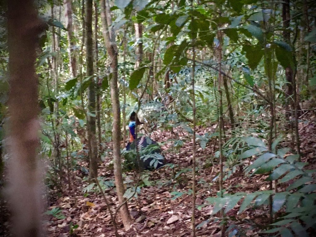 Five hundred metres into our walk, the bright blue cassowary plum became prominent on the forest floor leading to much speculation as to the presence of the elusive bird. Another 100 metres, and the strategic avoidance of a significant poop pile was necessary. Rather excited by the fresh mound, it was only another 100 metres until our eldest stopped dead, dropped the “oh s*&t,” and alerted us to two adults merely ten metres to our left. Although I have seen cassowaries many times, I had never seen two adults together before – they have either been solo, or a dad with chicks. Adult number one was sitting on the forest floor, completely unperturbed by our presence. Adult number two gave a cursory glance toward the open-mouthed humans before calmly turning around and moving off into the forest.