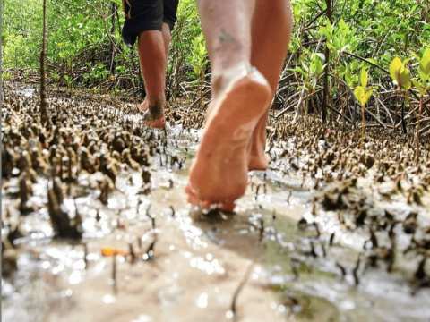 There are two options to experience the Jindalba area. The 700 metre, elevated and shady boardwalk, will keep your feet dry as it leads you over creeks and your brain active through interpretive signage. The boardwalk takes about 30 minutes to complete and does not require a high level of fitness.