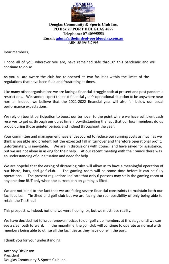 Members of The Tin Shed (the Douglas Community & Sports Club Inc) incorporating the Mossman Golf Club and its members have received a letter advising of the Club’s financial struggle and dire forecast emerging out of the COVID-19 lockdowns, and moving forward with government restrictions.