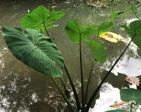 Taro is very effective at suppressing para grass (Urochloa mutica) and Singapore daisy (Sphagneticola trilobata) and keeping watercourses from being choked. It tends to easily bend over in floods, and therefore doesn’t block drains. It is a native, so planting these forms of taro will enhance our environment. Native trees, gingers, ferns etc will all grow through native taro, so planting it along watercourses is one of the best ways to reduce weed competition and facilitate the regeneration of our native ecosystems.