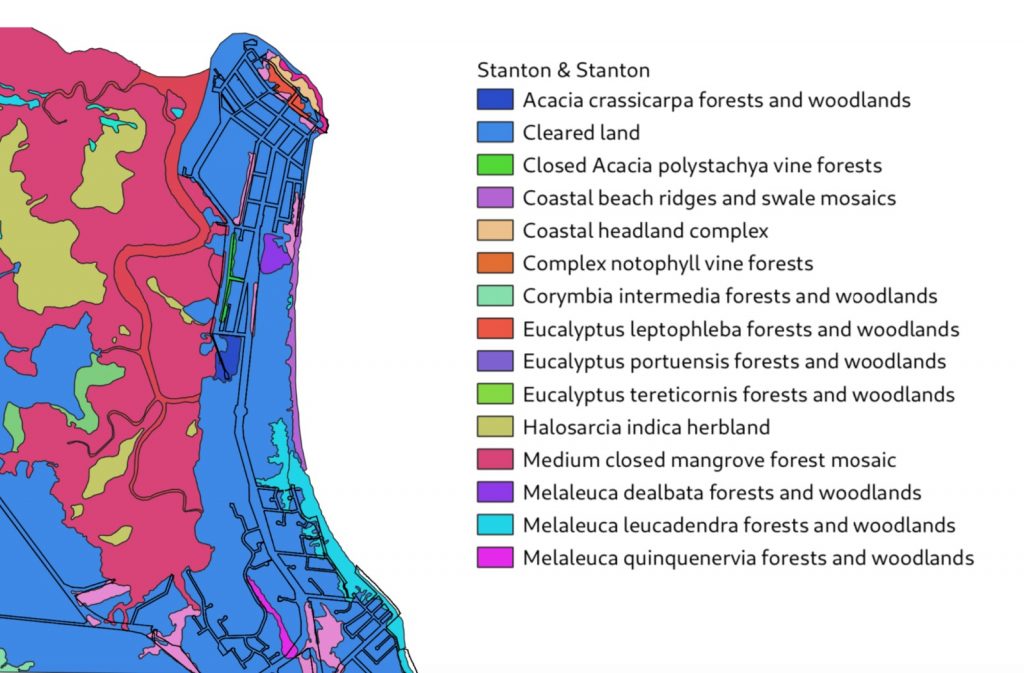 The vegetation map below was produced 30 years after Tracey and Webb by the Stantons in 2005. It shows most of the vegetation has been cleared, and that the vegetation types have changed. The most significant stand is the remnant Melaleuca leucadendra forest in the Solander Boulevard and Reef St foreshores (highlighted in light blue in the map below).