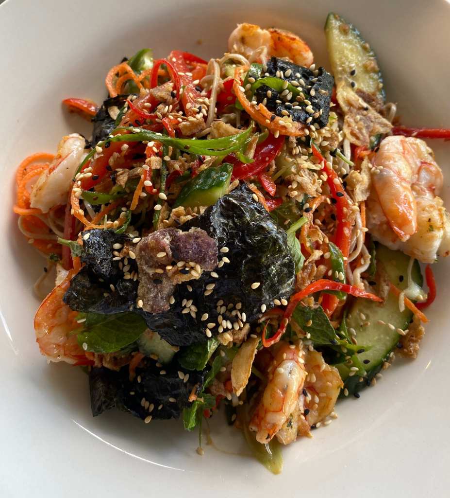 The lunch menu features small bites suited to sharing, main dishes and blackboard food and drink specials. Today’s freshly caught seafood and roast duck specials were tempting, but we were keen to try chef’s interpretation of the classic salt and pepper squid, a pork belly entree and the vegetarian soba noodle salad.