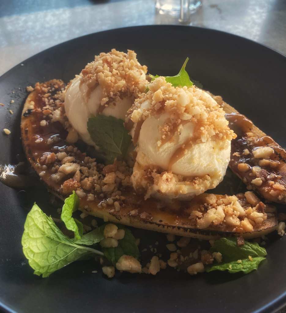 As we were loving every moment of the occasion, we couldn’t possibly resist wanting more, so shared the flame grilled banana with Mount Uncle rum sauce, crunchy macadamia nuts and vanilla ice cream for $14.50. This was a flawless balance of crisp toffee, crunchy nuts, silky ice cream and flamed banana.
