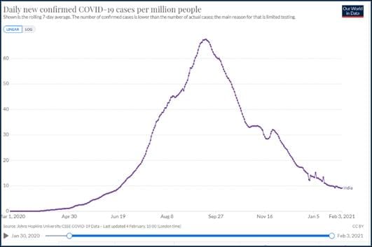 “The decline is not related to a lack of opportunity for transmission. India has fully reopened its economy, with elementary schools being the only major exception. Restaurants, malls and markets are bustling.”