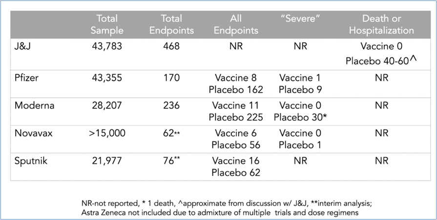 Eric Topol*** has updated his table summarizing Phase 3 results for four vaccines (J&J not included). An “endpoint” in a study is a defined outcome in a participant, such as proven infection. Most important is the “Severe” (endpoint) column. Only one “severe” outcome is noted on the vaccine arm of all trials.