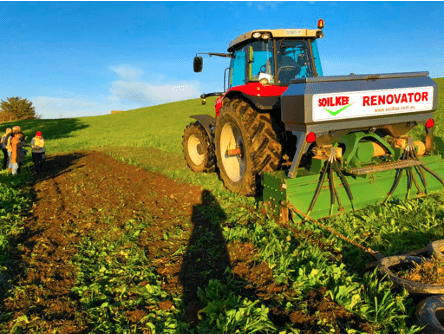 First the ground cover/pasture is grazed or mulched to reduce root and light competition. Then the Soil Kee breaks up root mass, lifts and aerates the soil, top-dresses the ground cover/pasture in narrow strips, and plants seeds, all with minimal soil disturbance. The seeds of the cover/cash crops are planted and simultaneously fed an organic nutrient such as guano. The faster the seed germinates and grows, the greater the yield. It is critical to get the biology and nutrition to the seed at germination and to remove root competition.