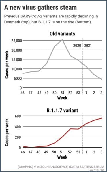 Dr Eric Ding has provided a table using Danish data to show how the number of new cases of the “old variants” is dropping while the more contagious B.1.1.7 strain looks as though it will dominate.