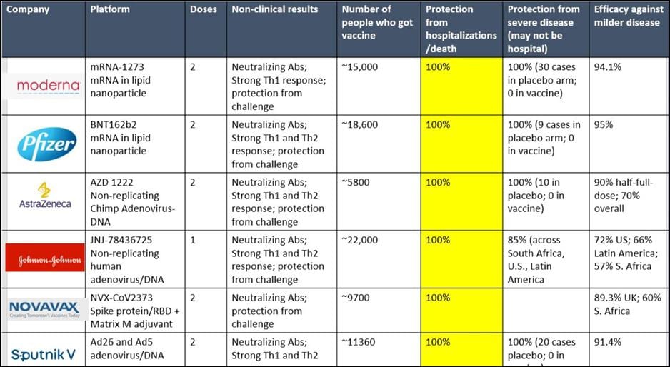 Note: this table does not contain the reduced efficacy against milder disease of the AstraZeneca vaccine against the B.1.351 variant. See below…