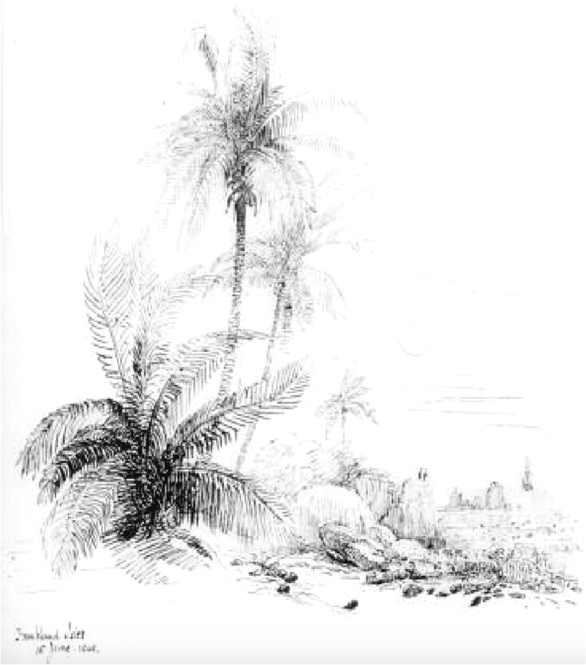 John MacGillivray, the naturalist on the HMS Rattlesnake, recorded finding two small groves of coconuts on Russell Island in the Frankland group. He described the mature trees full of nuts while conducting natural history research there between June 12 and June 19, 1848.(8)