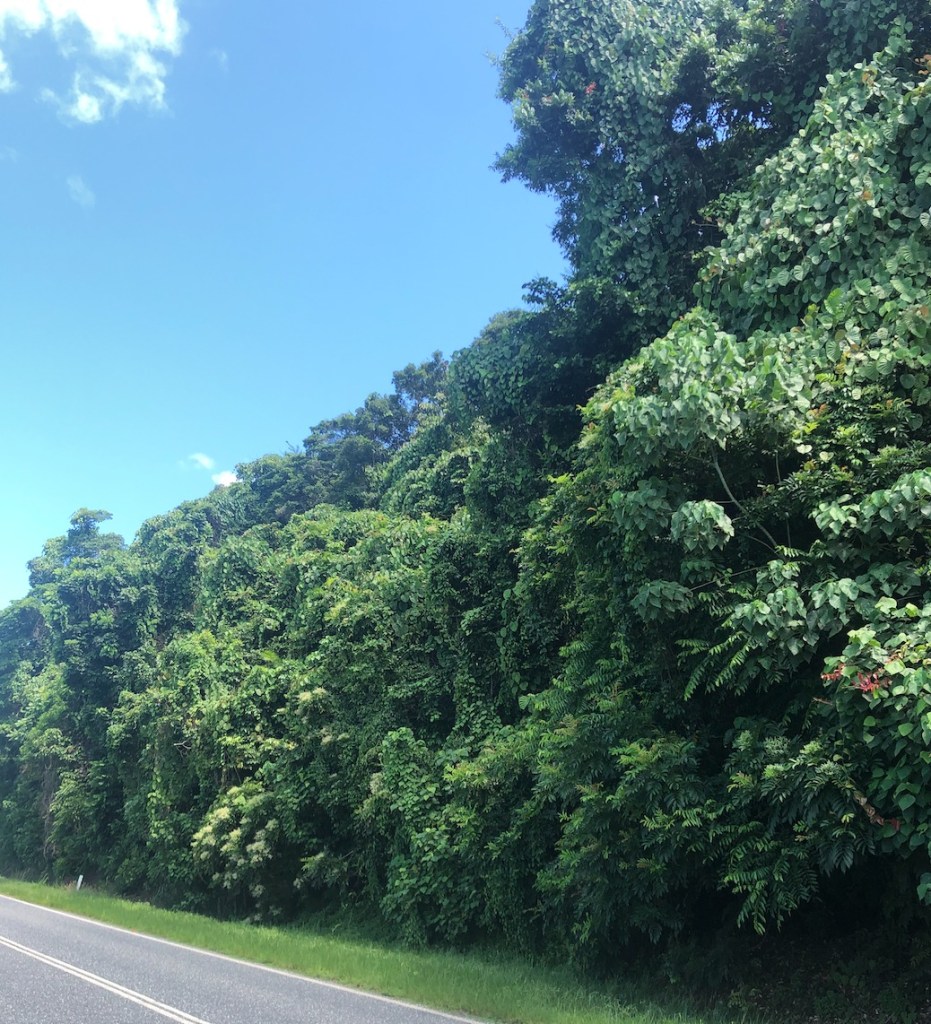 If you wish to be read – stick to the well known names – in this case Merremia peltata. Don’t confuse Merremia (a native) with the related purple morning glory (Ipomea purpurea/indica) – the bottom (smaller) leaves in your last roadside picture – are purple morning glory – considered an invasive. Merremia is an opportunistic plant and thrives on disturbance. I have seen many hectares of once arable land in Fiji, completely taken over by monocultures of Merremia (native there too) – and the landholders have given up. Anything trying to grow gets instantly overwhelmed by the Merremia. Don’t rely on it being a beneficent vine. Here in the Daintree the disturbance that was created by the Bloomfield track (and the resultant opening up to light) let Merremia flourish. I’ve been here 34 years – and there is no sign of natural recovery – in fact the only areas which have recovered, are where our volunteers “de-vined” and killed the Merremia. The tragedy is that belief is more powerful than reality.