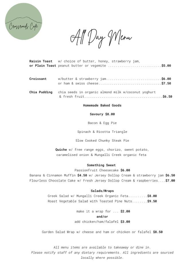 After last week’s epic re-opening night, Crossroads is turning it on again with their beloved fish n chips and open mic night from 6pm. You can preorder for takeaway via text or call 0477 7777 35. The cafe is also now open from Thursday-Sunday-check out their fabulous new menu below!
