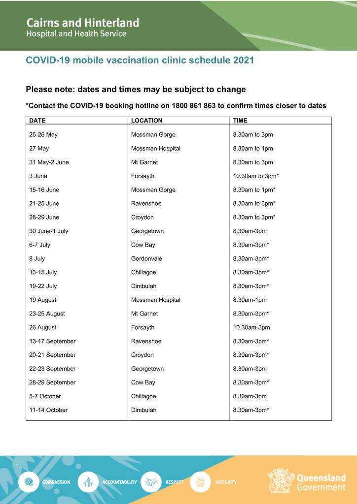 A new COVID-19 mobile vaccination clinic is set to tour rural and remote parts of the Cairns and Hinterland region, to deliver the COVID-19 vaccine to health workers, and eligible community members.