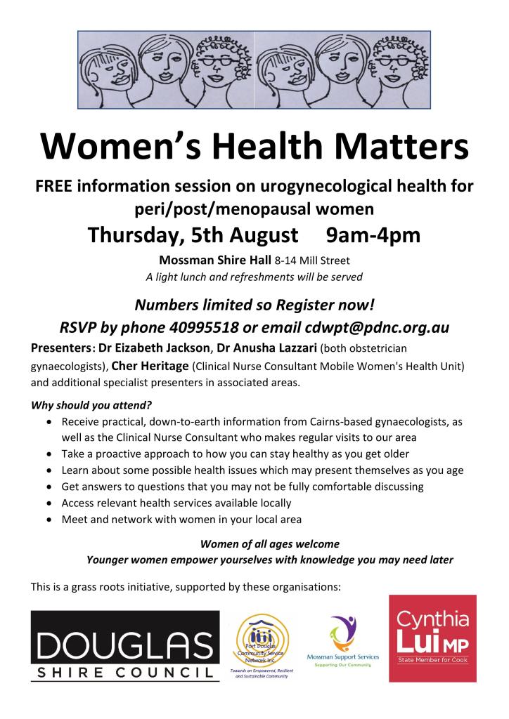 Women’s Health Matters is a grassroots initiative, supported by Douglas Shire Council, the Office of Cynthia Lui State Member for Cook, Mossman Support Services, and Port Douglas Community Service Network.