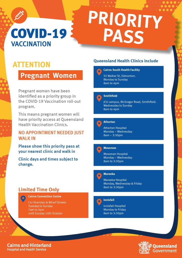 The “Priority Pass” is being used in Cairns, Atherton, Mareeba, Innisfail and Mossman. This provides First Nations communities with priority access at Queensland Health Vaccination Clinics. No appointment is needed – just walk in.
