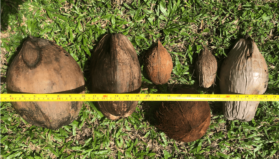 Many of the coconuts palms on the beach foreshore adjacent to the old plantation have large spherical niu vai nuts or intermediate forms that are either elongated or smaller in size. Only a few kilometres away at Rocky Point, there is a diversity of palm and nut types including niu vai, niu kafa, small and intermediate forms on the littoral foreshore as shown in Figures 2,3,4,5&6. The same diversity can be found 15 kilometers away by sea, on the littoral foreshore of Four Mile Beach at Port Douglas. Figures 2,3,4&5 show different forms of niu kafa and niu vai kernels including unique elongated kernels and examples of very small nuts and spindle shaped nuts that grow on tall trees. The crown shapes of the niu kafa palms can be clearly distinguished from the niu vai as shown in Figures 5 and 6.