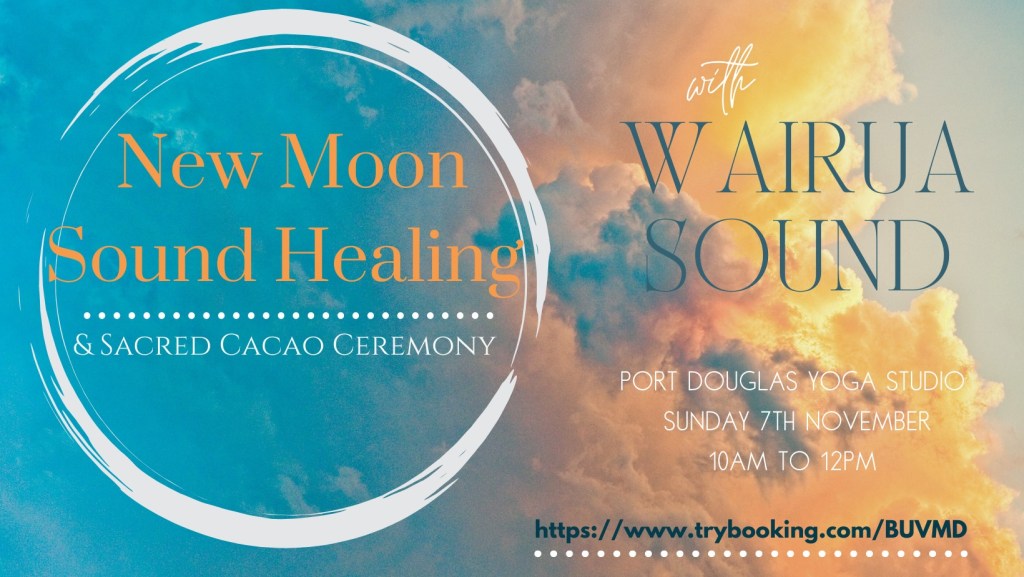 NOVEMBER NEW MOON CEREMONY / A gentle return to self, held by intuitive crafted sound-scape and the sacred medicine cacao. Join Wairua Sound at Port Douglas Yoga Studio at 10am for a 2 hour surrender to heart medicine, guided meditation and new moon ritual. Bookings via https://www.trybooking.com/BUVMD or contact murphy@wairuasound.com to secure a place and pay on the day.