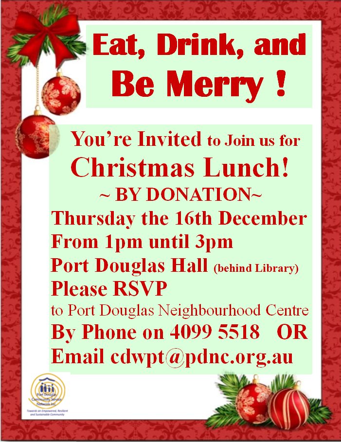 Help Mossman Community Centre help our community this Christmas.  We are calling for small gifts for not only children but men and women of all ages. Gifts are handed out on Christmas day at our Christmas Day lunch. We also welcome monetary donations so that we may shop for appropriate gifts for those age groups who may miss out on donated items.