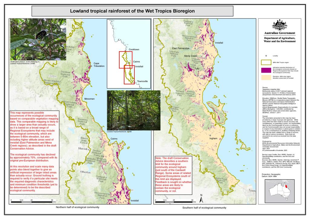 Each year on behalf of the Threatened Species Scientific Committee, the Department of Agriculture, Water and the Environment invites public nominations for items that merit listing as threatened under national environment law. The Lowland Tropical Rainforest of the Wet Tropics Bioregion was nominated for listing as a threatened ecological community in 2017 and was prioritised for assessment that year.