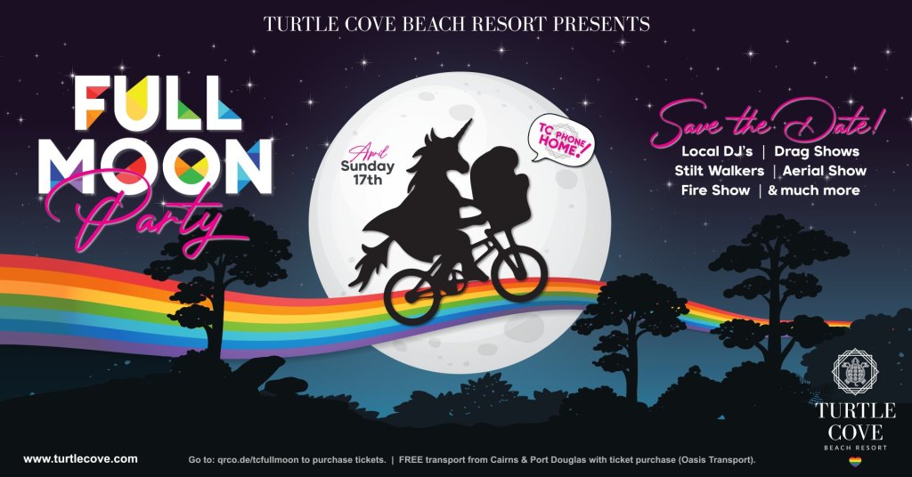TURTLE COVE FULL MOON PARTY / Jump in to your best rainbow theme to win a prize and get ready to sparkle like a unicorn! food truck, fire, LED, silk, stilt and drag shows along with fab DJs and lots more surprises. Early bird tickets for $38 end at 5pm on Friday-if you miss out tickets are $100 at the door with no FREE transport – GRAB YOUR TICKET NOW!