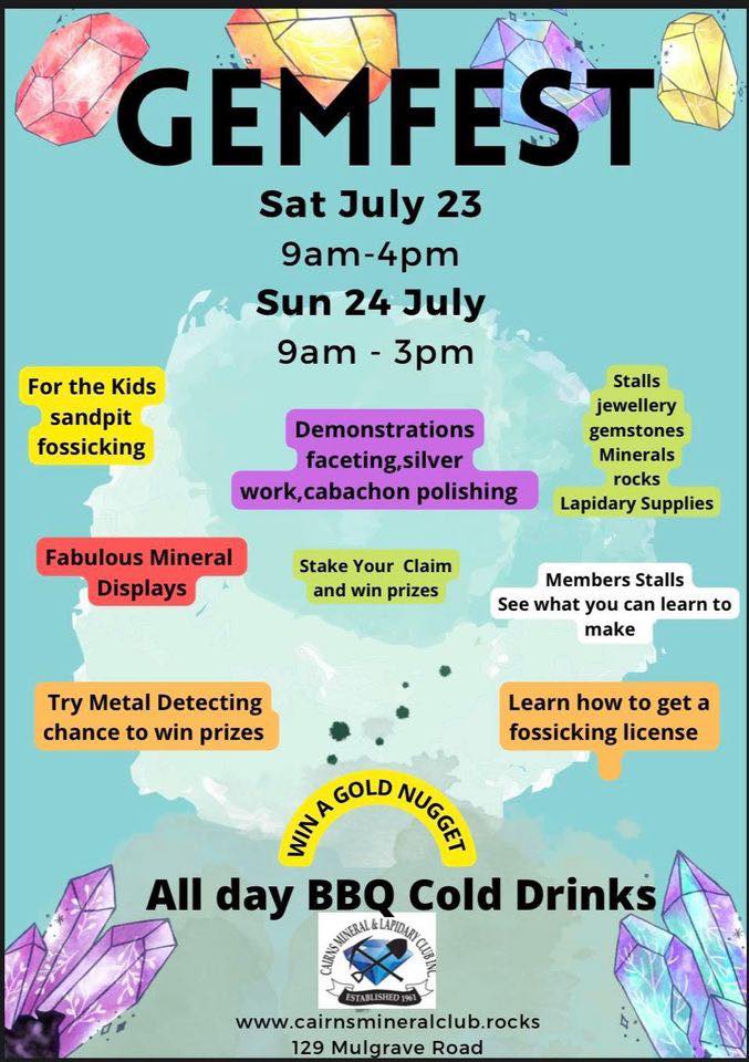 GEMFEST / Cairns Mineral and Lapidary Club, Mulgrave Rd, Cairns. Featuring gems, minerals, gold panning, jewellery making and cabochon making. FURTHER DETAILS.