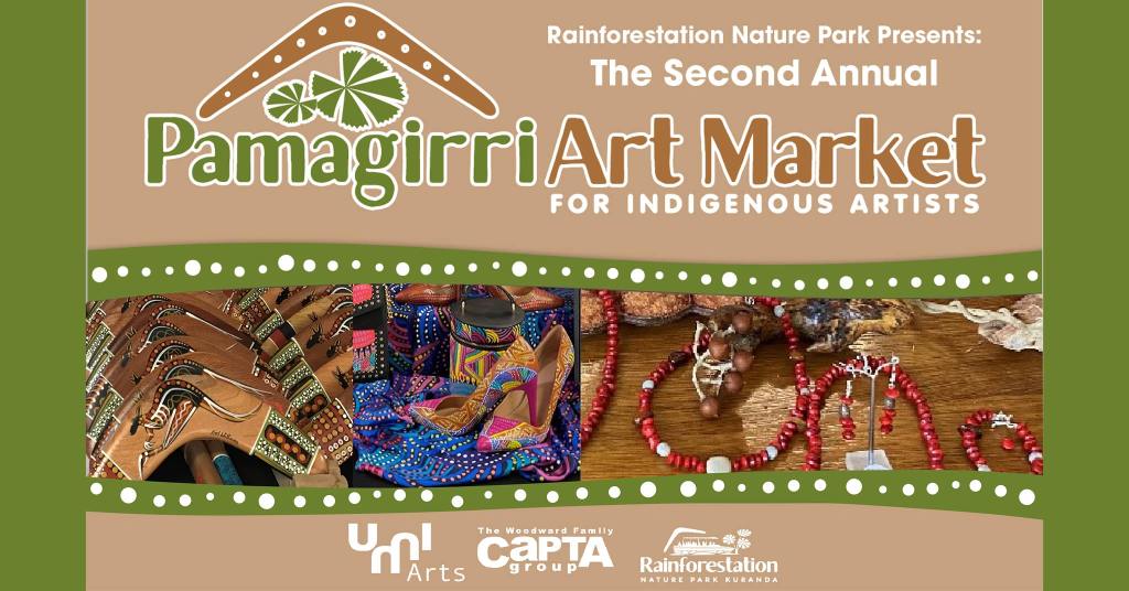 PAMAGIRRI ART MARKET / Rainforestation, Kuranda. Come and browse a range of authentic and affordable Indigenous artworks that could be a beautiful addition to your home or a unique Christmas gift for a loved one. Proudly delivered in partnership with UMI Arts who work to create pathways for Aboriginal and Torres Strait Islander artists towards economic independence in the creative industries. Further details.
