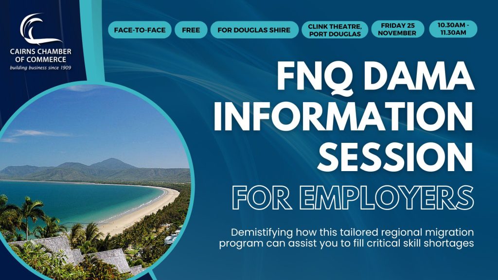 FNQ DAMA Information Session for Employers / Cairns Chamber of Commerce Migration Manager Geoff Heath invites employers to a free, face-to-face information session on the Far North Queensland Designated Area Migration Agreement, otherwise known as the FNQ DAMA. The FNQ DAMA is a skilled migration program that is tailored to the needs of the Far North Queensland region. The FNQ DAMA differs in many ways from standard skilled migration pathways, providing more flexibility and certainty for both employers and workers. Further details and registration.