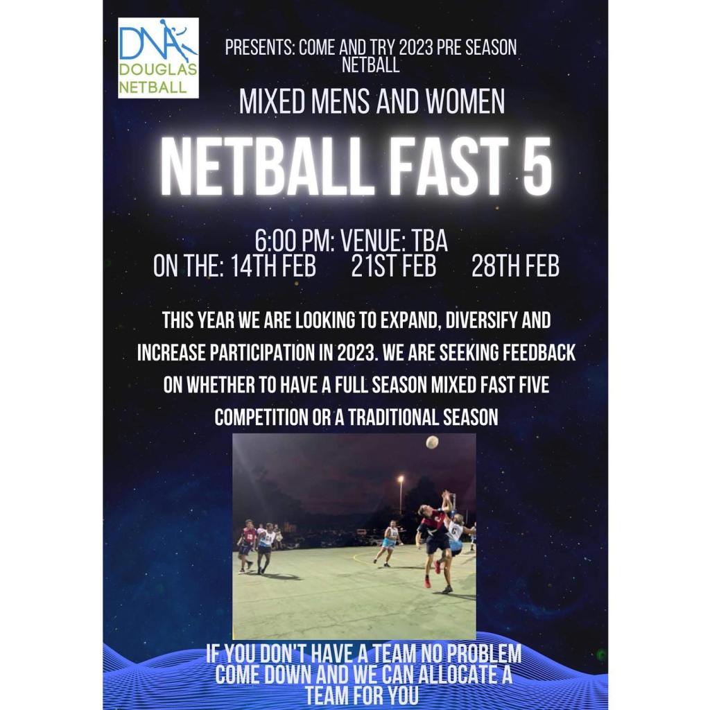 Netball ⟼ Kicking this year’s pre season off with a free casual mixed men and women’s fast five competition over three weeks starting 14 Feb. Dust the cobwebs of your sneakers and get your teams together and get back into netball If you don’t have a team-they’ll help you find one!