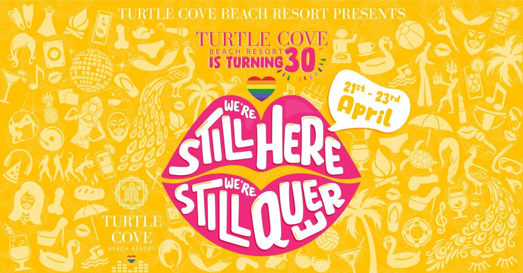 - Turtle Cove Beach Resort hosts a weekend of Still Here Still Queer 30th Birthday celebrations, featuring MCs, entertainment by Dolly Diamond and Jack Vidgen, and an eclectic selection drag, DJs, fire shows, street performers and plenty more. Very limited tix remain-book via link above, or by clicking on image below.