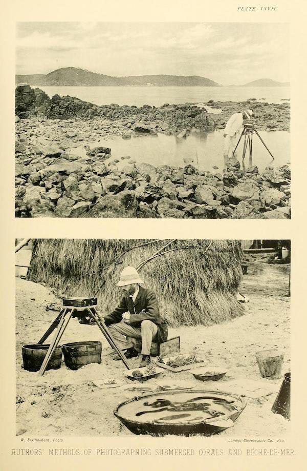 With a specially constructed four-stand, Saville-Kent waded into waters at low tide to photograph coral from above as large-format prints. 48 photographs in the book were captured by Saville-Kent and then reproduced by the London Stereoscopic Company.