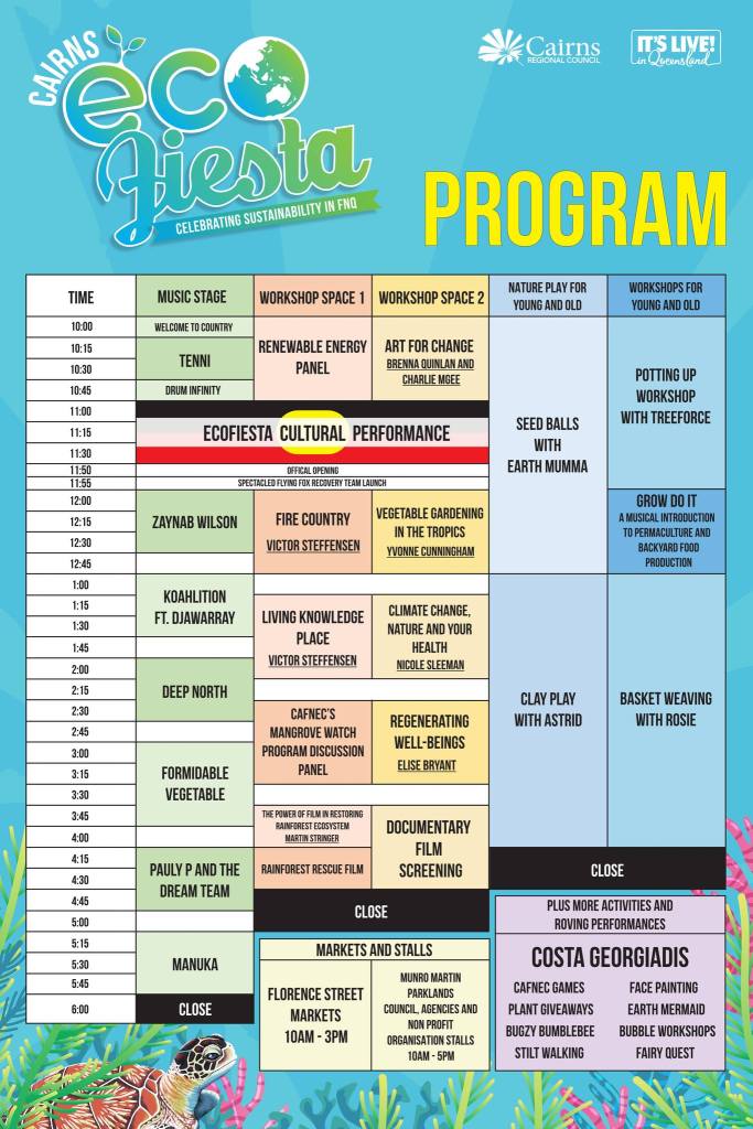- With our local environmental groups, climate committees, reef and rainforest authorities and smart, green businesses in attendance, along with thousands of residents and visitors, Ecofiesta is a unique chance to connect with an ancient landscape, and the organisations and individuals working for its protection.