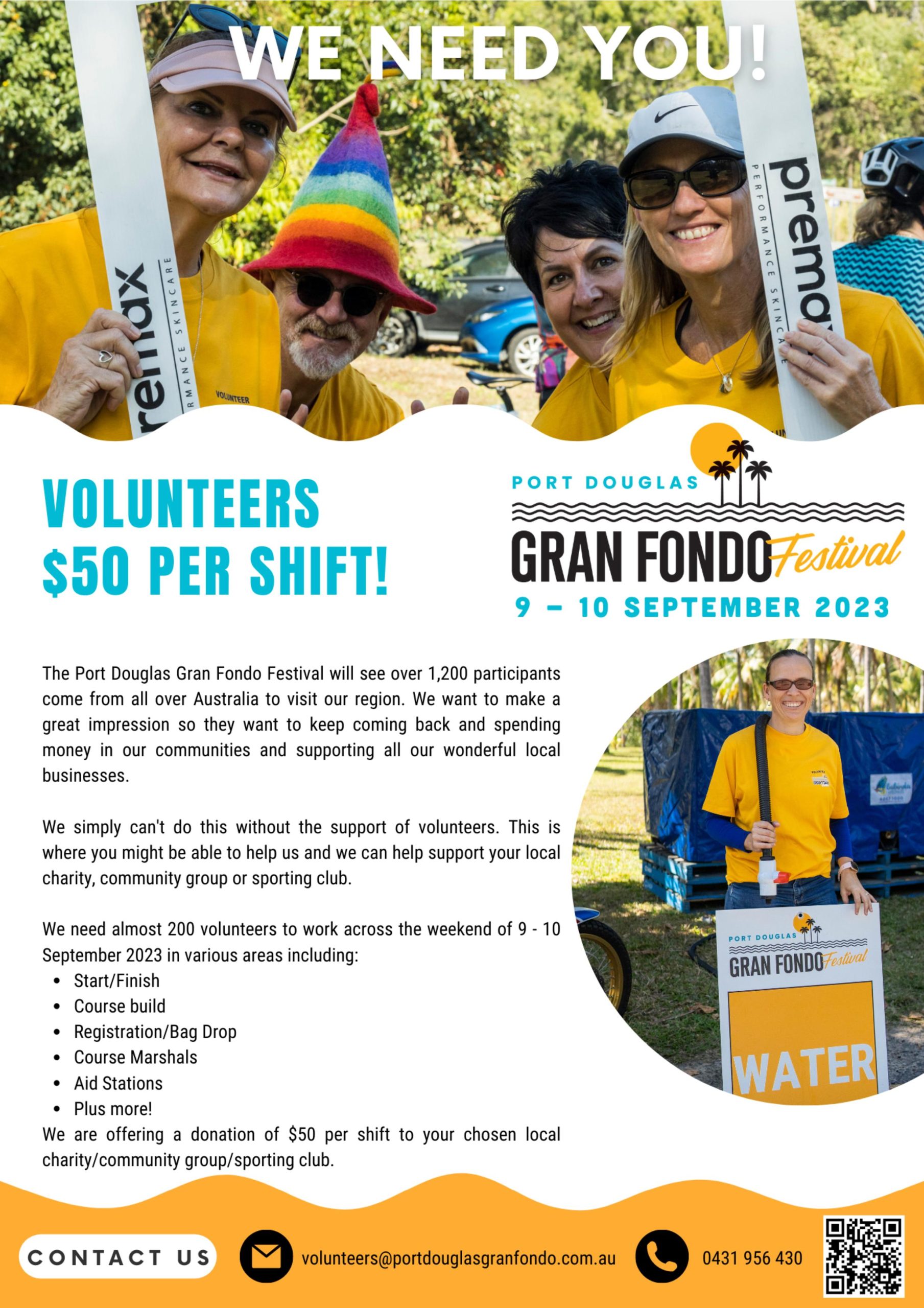 Volunteers form an integral part of the event and make a huge impact on the experience for event riders. Gran Fondo appreciates volunteers and the efforts they put in to make the Port Douglas Gran Fondo successful, which in turn benefits the greater Far Northern community.