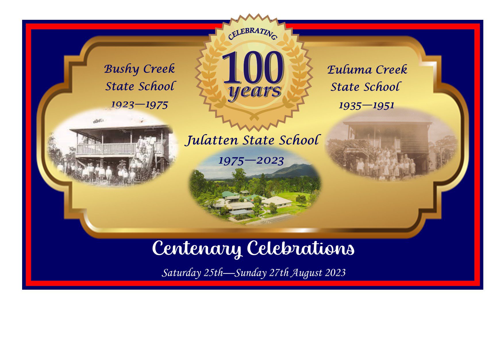 Family Fun Day with music, entertainment, rides and games, Roll Call by the decades, Mareeba Heritage Museum display, student performances, best decorated Centenary themed cake, oldest past student and youngest current student in attendance to cut the Centenary cake, opening of Time Capsule, BBQ lunch and bus tour for past Euluma Creek State School students to visit their old school. Open mic for past principals and students to share their memories.